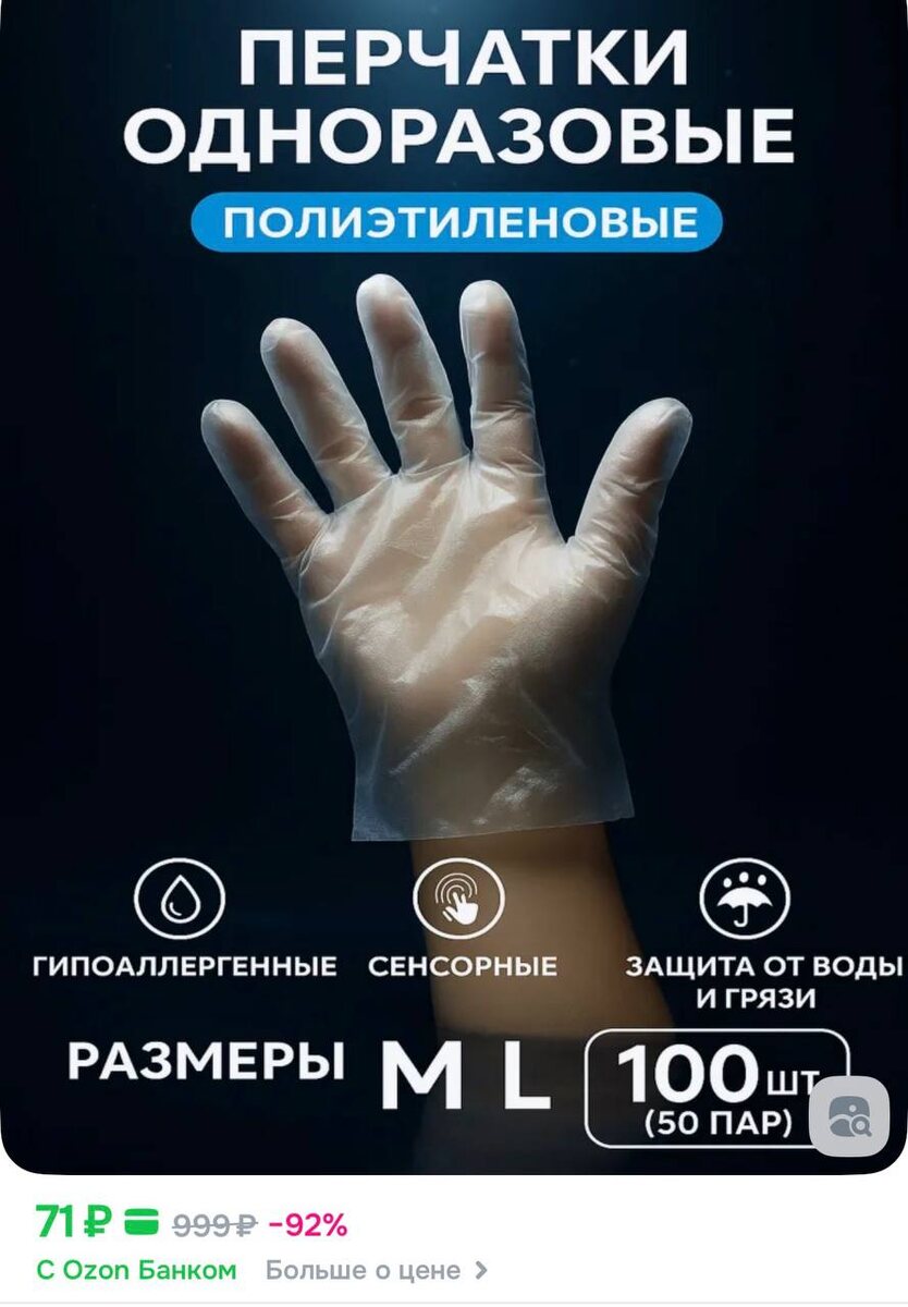 😀😀Перчатки одноразовые полиэтиленовые, 100 штук (50 пар), размер M