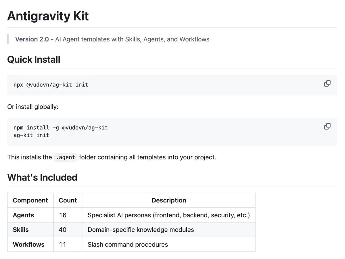 Antigravity Kit предоставляет набор шаблонов для создания AI-агентов с различными навыками и рабочими процессами. Включает 16 специализированных агентов, 40 модулей знаний и 11 команд для автоматизации задач. 🚀 Основные моменты: - 16 специализированных AI-агентов для разных задач - 40 модулей навыков для контекстуального применения - 11 команд для упрощения рабочих процессов - Автоматическое применение правил из конфигурации - Полная документация по архитектуре и использованию 📌 GitHub: https://github.com/vudovn/antigravity-kit #javascript