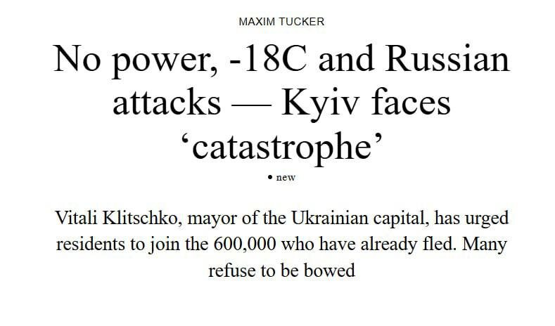 Мэр Киева заявил об этом в интервью The Times. По его словам, только в январе столицу покинули 600 тысяч человек, а во время двух последних ракетных атак удары пришлись по тепловым станциям. Кличко также заявил, что Зеленский «неразумно» разжигает политический конфликт внутри страны в тот момент, когда ей необходимо единство. «Выступая из киевской мэрии, где сотрудникам запретили пользоваться туалетами из-за отсутствия водоснабжения, он сказал, что Зеленский отказал ему в просьбе о встрече для обсуждения кризиса, хотя производство электроэнергии и противовоздушная оборона находятся в ведении центрального правительства», — пишет The Times. @dlon Новости от Dlon. Подпишись
