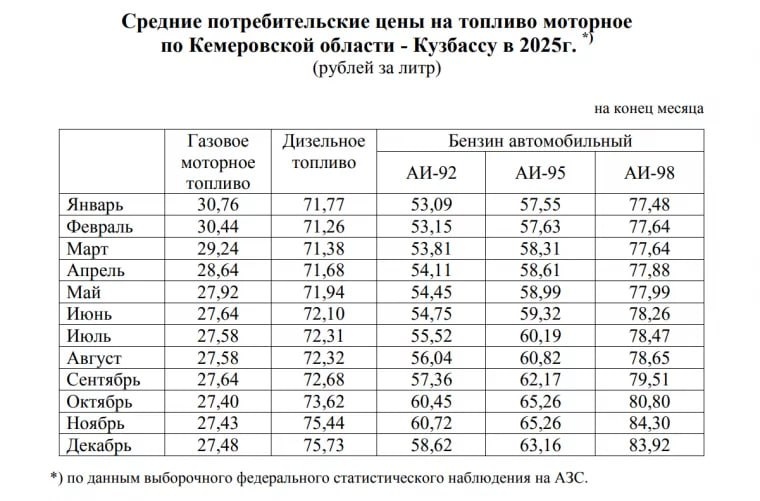 В январе прошлого года газомоторное топливо стоило 30,76 рубля за литр, спустя 12 месяцев его цена снизилась на 3,3 рубля, до 27,48 рубля. Всё остальное топливо — и дизельное, и бензин — значительно подорожало. Литр АИ-92 в январе 2025 года стоил 53,09 рубля, в декабре подорожал на 5 рубля, до 58,62 рубля. Цена за литр АИ-95 в начале года — 57,55 рубля, в конце года выросла на 5,6 рубля и достигла 63,16 рубля. АИ-98 за год подорожал на 6,5 рубля: с 77,48 до 83,92 рубля за литр. Дизельное топливо за 12 месяцев выросло в цене на 4 рубля: в начале года литр стоил 71,77 рубля, в конце — 75,73 рубля. ПОДПИШИСЬ 🔴 ПРЕДЛОЖИ Ⓜ МАХ НАШ