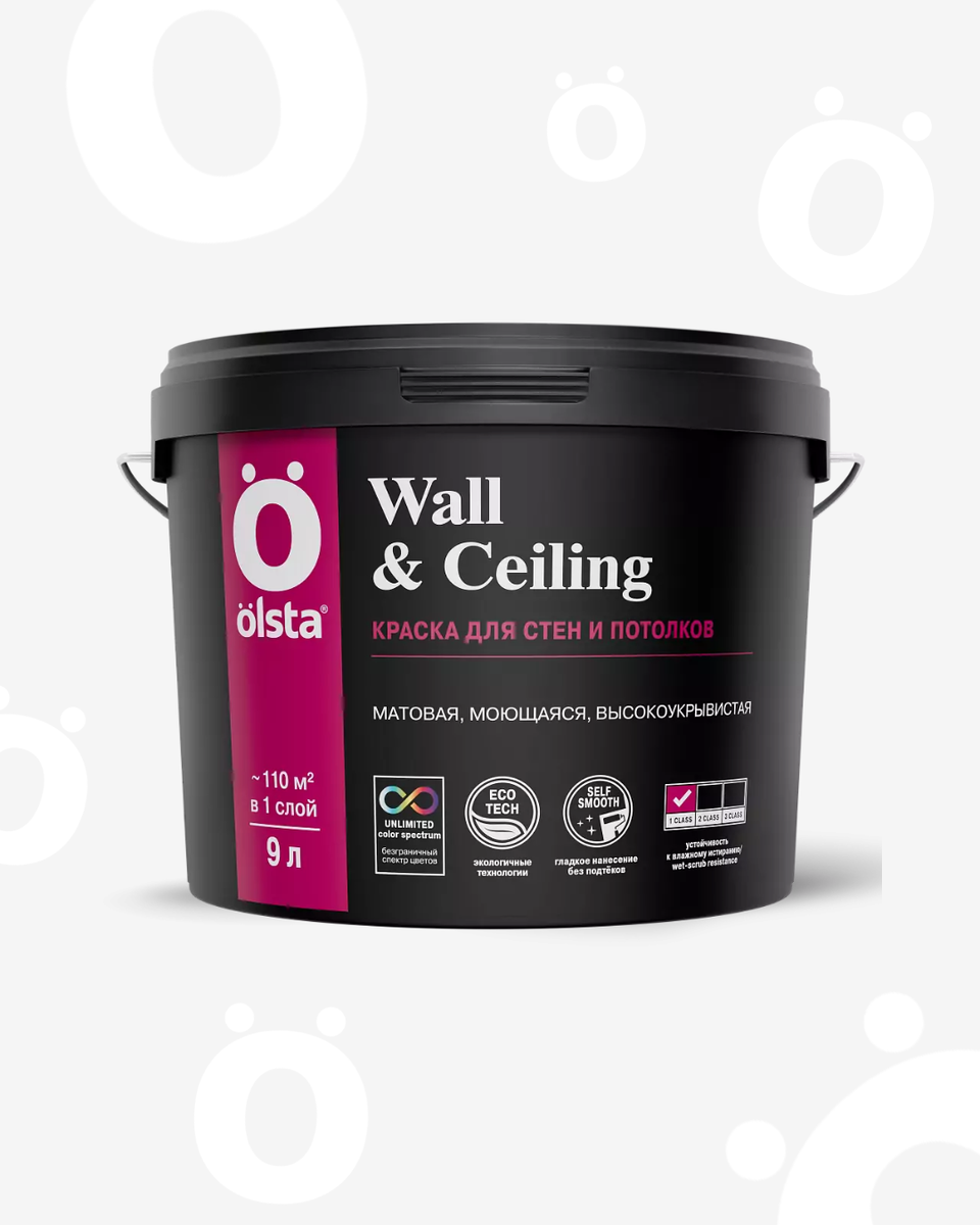 Интерьерная водно-дисперсионная краска Olsta Wall & Ceiling создана специально для тех, кто ценит идеальный результат: матовая белоснежная поверхность обеспечит ровное и гладкое покрытие без подтеков и брызг. Эта краска легко наносится, долговечна и безопасна для использования в жилых помещениях, включая детские и медицинские учреждения. Идеальна для использования на стенах и потолках в любых интерьерах с нормальной эксплуатационной нагрузкой. Преимущества: ✔️ Ровное покрытие без подтеков и следов инструмента ✔️ Идеальная гладкость благодаря технологии OLSTA Self Smooth ✔️ 1 класс стойкости к мокрому истиранию (DIN EN 13 300) ✔️ Без запаха, подходит для детских и медучреждений Видео-инструкция по нанесению по ссылке. Рекомендации по применению: Фасовка: 0,9 л / 2,7 л / 9 л