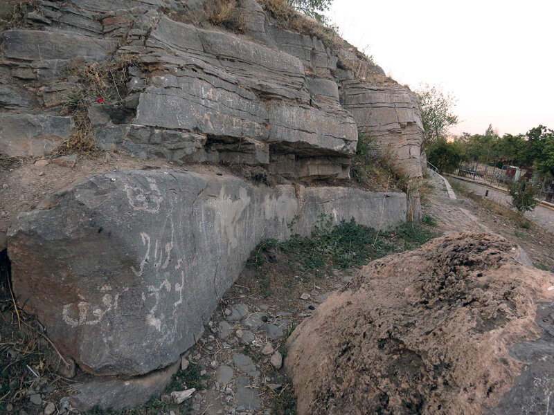 Сулейман-гора, нависающая над Ошем - явный прототип киргизских "духовных парков" (Манас-Ордо, Рух-Ордо в Чолпон-Ате, Бурана). Говорят, поклоняться ей люди стали чуть ли не в каменном веке, да и имя Соломона тут возможно аллегория, что-то вроде Царь-гора. Отмечен и намолен на Сулейманке едва ли не каждый квадратный метр, и самая пожалуй распространённая, но вместе с и сама незаметная её деталь - петроглифы: Их очень легко не заметить среди современных надписей и естественных пятен на камне. Самое большое их скопления на скалах у подножья, но пройдя там первый раз, я ничего не заметил в упор! Однако вечером на вершине я случайно повстречал молодого гида, разговорился с ним и... словно Гора сама решила не дать мне уйти, не увидев петроглифов. Ну а потом, пересматривая фотографии, я обнаружил, что фотографировал рисунки и в других местах, но просто не замечал их! Да и правда - здешние петроглифы непохожи на всё, что мне приходилось видеть раньше: достаточно сравнить с первобытными Саймалуу