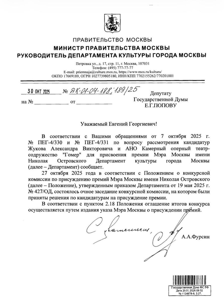 Получил ответ на мой депутатский запрос — театру вручили премию Мэра Москвы имени Николая Островского. От всей души поздравляю замечательных артистов и желаю творческих успехов! Евгений Попов в MAX / ВК