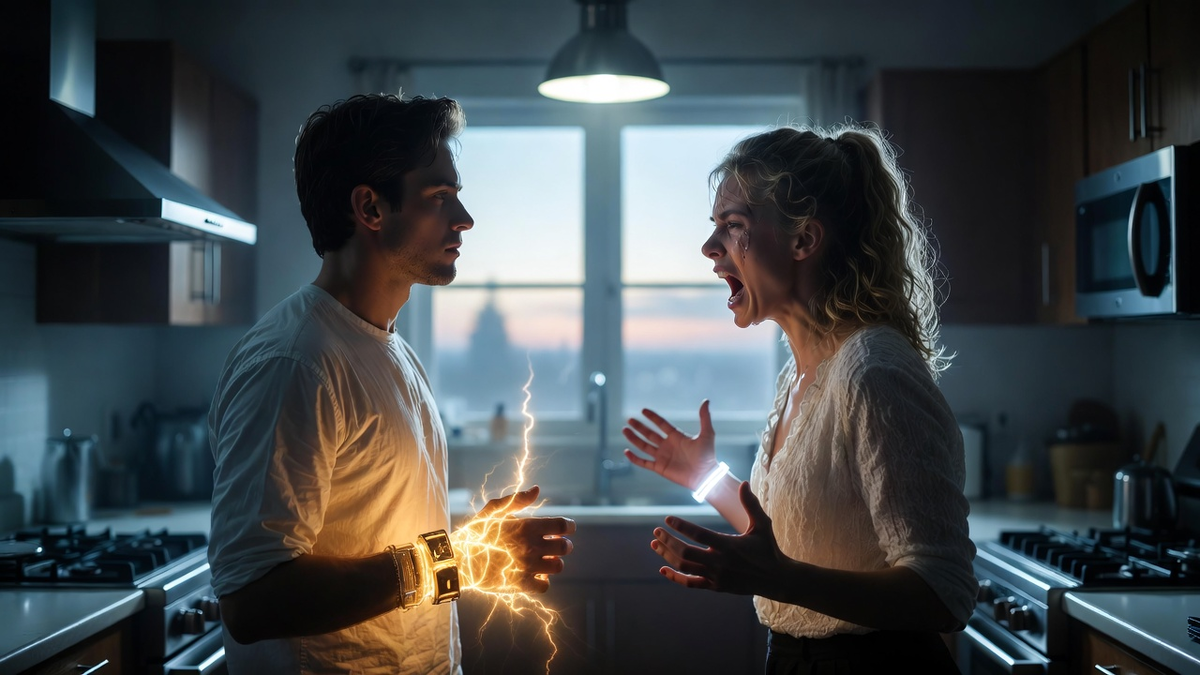 Я вошла в квартиру на рассвете, измученная, в той же одежде, в которой убегала. Максим не спал. Он сидел на кухне, при свете одной лампы, и лицо его было не сердитым, а… озабоченным. На столе перед ним лежал его планшет, а на запястье браслет светился не обычным белым, а мягким, пульсирующим золотистым светом — цветом, который я раньше не видела.