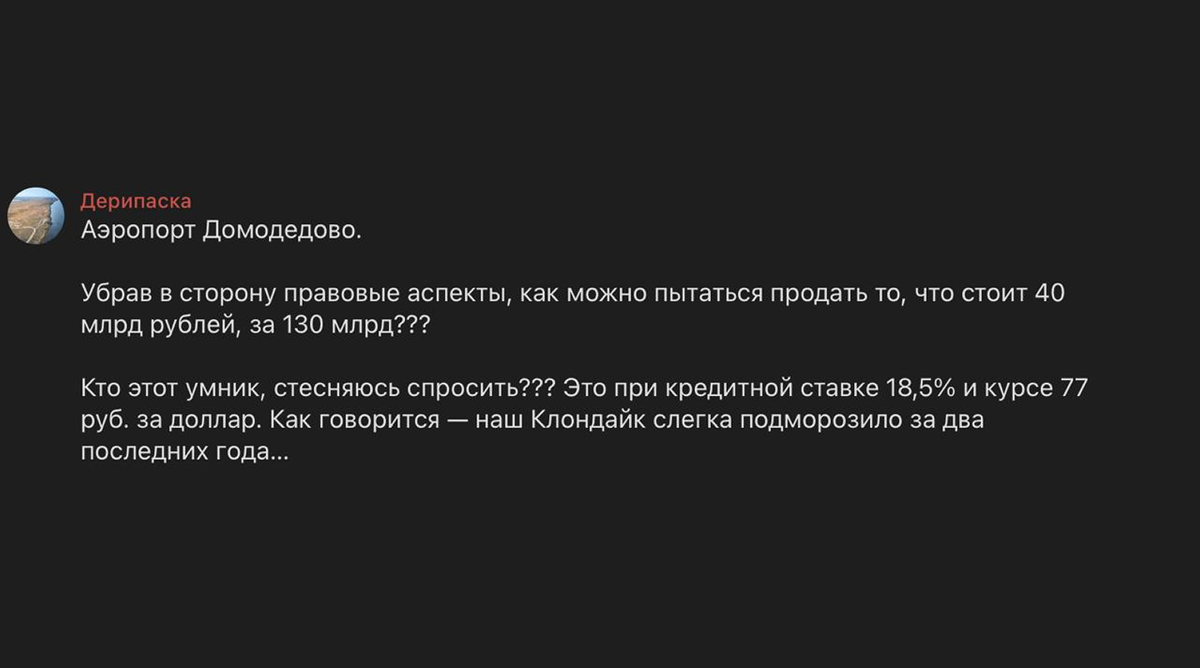 Бизнесмен и основатель ПГ «Базовый Элемент» Олег Дерипаска заявил, что не понимает, почему «Домодедово» стоит так дорого — 132 млрд