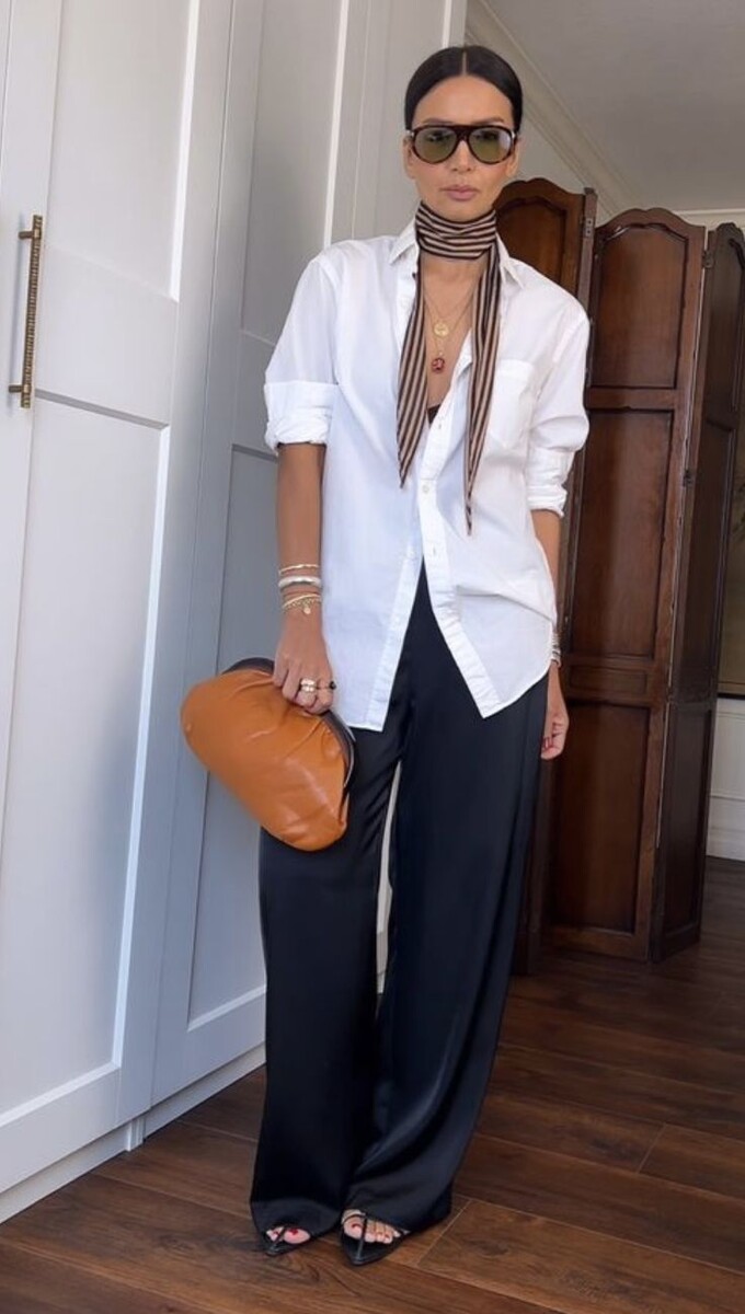 Платок – это универсальный аксессуар, способный мгновенно преобразить любой образ, добавив ему индивидуальности и французского шарма. А в сочетании с белой рубашкой он раскрывается особенно ярко.