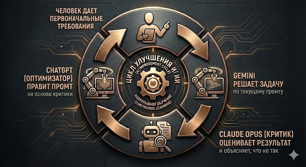 TextGrad - это как обратное распространение ошибки, но для текста, а не для весов нейросети. Схема простая: 1️⃣ Эксперт пишет задачу - требования 2️⃣ Модель (Gemini) решает задачу по текущему промту 3️⃣ Другая модель (Claude Opus) (критик) оценивает результат и объясняет, что не так 4️⃣Третья модель (ChatGPT) (оптимизатор) правит промт на основе критики. Получается полуавтоматический цикл улучшения. Проверяю все сложные задачи: качество вырастает до 70%. ✨Главное не нужно гадать, почему промт не сработал. Модели сами находят слабые места и исправляют друг друга. Для полноценной автоматизации нужно настраивать цепочку в n8n или аналогах. В обычном интерфейсе: просто диалог и копирование результата из модели в модель. Всем здоровья, мира и добра! #ИИпромтингв2026