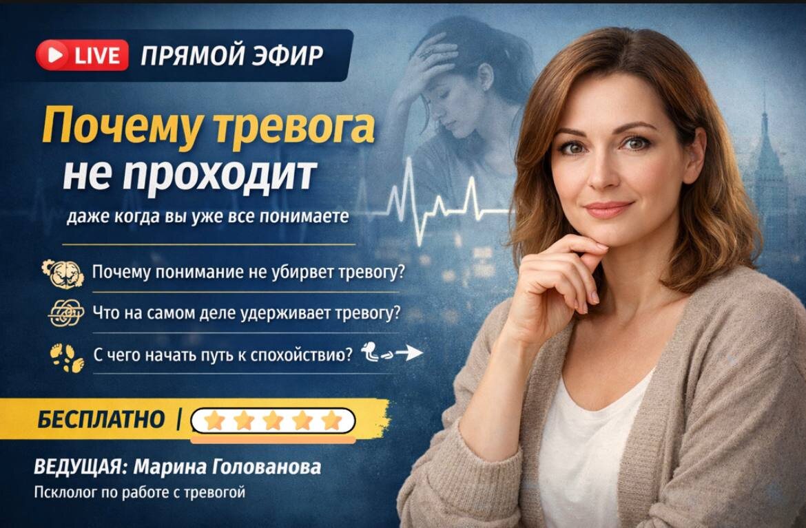 🔴🔴🔴🔴🔴 «Почему тревога не проходит, даже когда вы уже всё понимаете» 📅 Дата: 22.01 четверг ⏰ Время: 19:00 по мск 📍 Формат: онлайн, бесплатно Вы можете знать, что: — это не инфаркт — не инсульт — не “сходишь с ума” — не опасная болезнь Но тревога всё равно держит. Симптомы приходят. Тело пугает. Мысли накрывают. И в какой-то момент появляется вопрос, который очень сложно признать: «Почему, если я всё понимаю, мне всё равно плохо?» Если вы: уже читали про тревожные расстройства понимаете, что “дело в нервной системе” были у врачей, и вам сказали “всё в норме” но тревога, страхи и симптомы всё равно возвращаются этот эфир для вас. О ЧЁМ БУДЕМ ГОВОРИТЬ НА ЭФИРЕ 🔹 Почему понимание не равно изменение состояния 🔹 Почему тело продолжает реагировать, даже когда разум “всё понял” 🔹 Что на самом деле удерживает тревогу годами 🔹 Почему попытки “убрать симптомы” часто делают хуже 🔹 Как выглядит реальный путь выхода, без насилия над собой 🔹 С чего начать, если вы устали и нет си