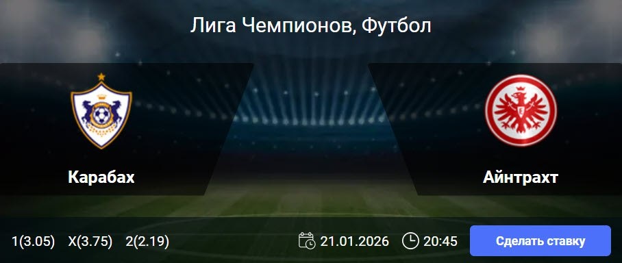 Статистика Карабаха: В семи из девяти последних игр клуба в ЛЧ обе команды забивали. В семи из девяти предыдущих встреч «Карабаха» в турнире было забито не менее трех голов. Команда пропускала в шести из восьми последних домашних матчей Лиги чемпионов. Статистика Айнтрахта: «Айнтрахт» пропускал как минимум два гола в шести из восьми последних матчей ЛЧ. На выезде команда не побеждала в пяти из шести предыдущих игр турнира (одна ничья, четыре поражения). В пяти из семи последних гостевых матчей Лиги чемпионов клуб забивал не более одного мяча. 🎯 ТБ (2.5) 🎲 кф (1.51) 👉 СДЕЛАТЬ СТАВКУ 🎁 ФРИБЕТ WINLINE - 3000₽ (промокод: BETWIN) 👉 СМОТРЕТЬ ПРОГНОЗ 👇 Подпишись на нас 🧿 ВКонтакте ✈️ Телеграм 📎 Сайт