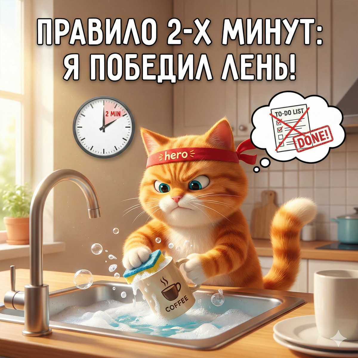 Правило 2-х минут: Магия, которая реально работает 🪄 Бывало такое? Висит мелкое дело (ответить в Telegram, помыть кружку, убрать одну вещь на место), вы откладываете его «на потом», а через неделю это превращается в гору из невыполненных задач и грызущую совесть. Суть правила предельно проста: Если дело занимает меньше 2-х минут — СДЕЛАЙ ЕГО ПРЯМО СЕЙЧАС. Не записывай в список дел, не планируй на завтра. Просто встань и сделай. Почему это работает? Мозг не успевает включить сопротивление. 2 минуты — это слишком мало, чтобы начать страдать и прокрастинировать. Эффект домино. Сделав одно мелкое дело, вы получаете микро-дозу дофамина. Это дает заряд энергии на что-то более крупное. Чистота в голове. Вашу «оперативку» больше не занимают десятки мелких мыслей-напоминалок. С чего начать прямо сейчас? Выбросьте чек из кармана. Ответьте на сообщение, которое висит со вчера. Заправьте кровать (если вы в ней до сих пор, мы не осуждаем, это же позитив!). Помните: Самое сложное — это начать. А че