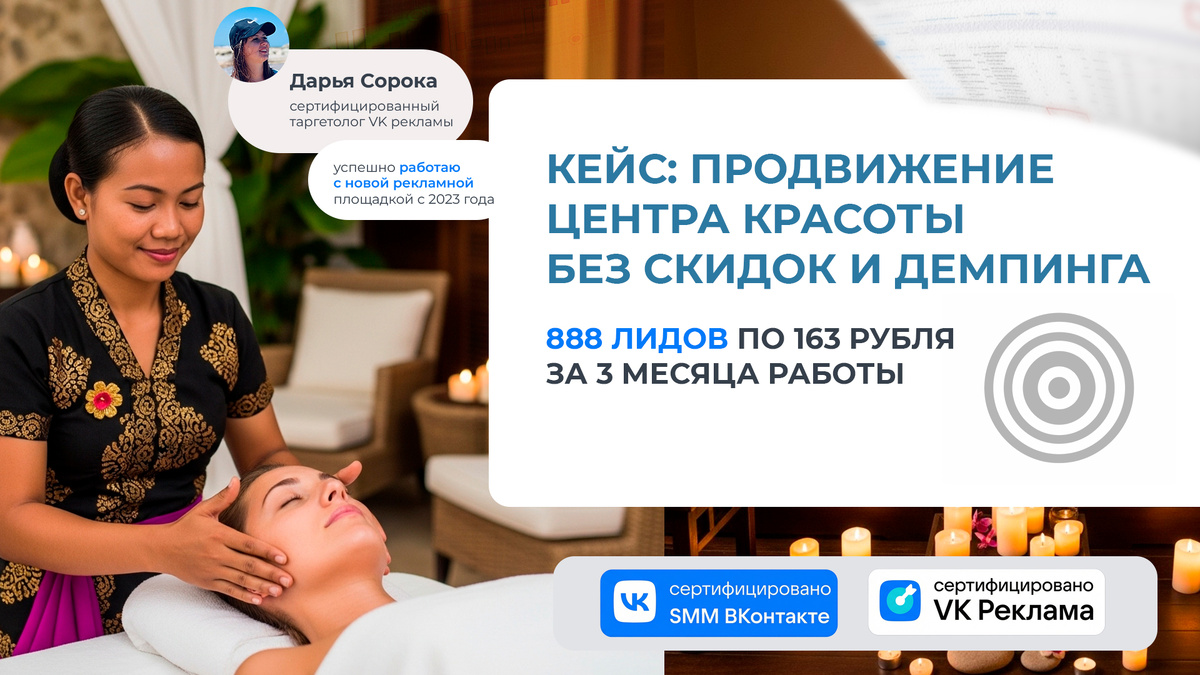 В сентябре 2025 года ко мне для настройки таргетированной рекламы обратился маркетолог центра красоты и здоровья в небольшом городе с населением 180 000 человек. Кейс о том, как мы продавали балийский массаж стоимостью 4900 без скидок и демпинга.
