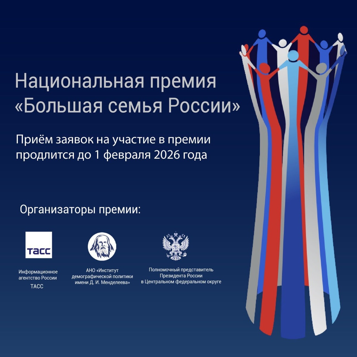 » В нашей стране организована новая национальная премия «Большая семья России» http://cfo.gov.ru/news/news_2025/52858/. К участию приглашаются журналисты, редакции средств массовой информации и блогеры, создающие качественную информационную продукцию, которая направлена на укрепление института семьи и продвижение традиционных семейных ценностей в обществе. Эксперты премии отмечают, что основными критериями оценки работ станут профессиональное мастерство и позитивный социальный эффект. Заявки принимаются до 1 февраля 2026 года. К участию допускаются материалы, опубликованные с 1 января 2024 года. Премия учреждена информационным агентством России ТАСС совместно с институтом демографической политики имени Д.И. Менделеева при поддержке полномочного представителя Президента страны в ЦФО.