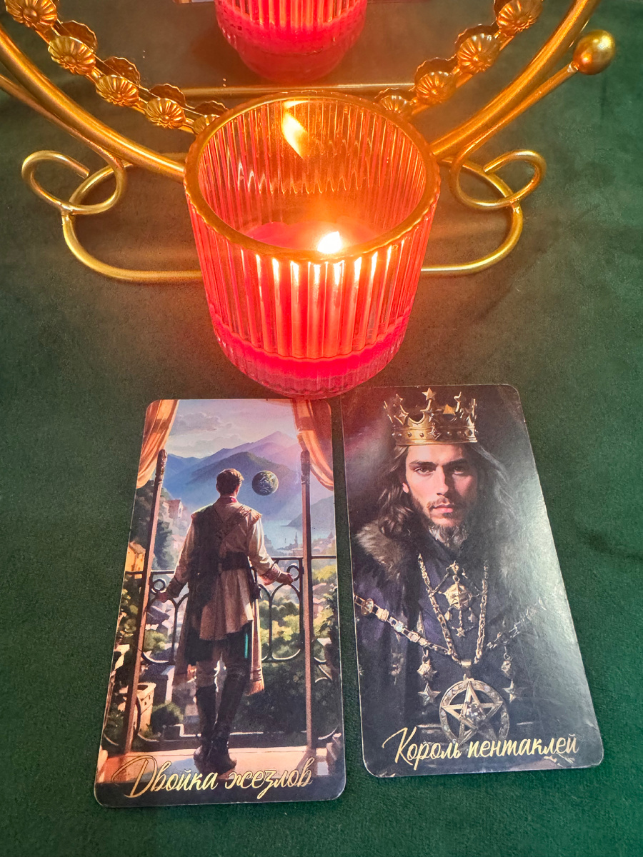Смотри… о нём пришли сразу две карты: Король Пентаклей и Тройка Жезлов. Давай разберём их как следователь разбирает улики.