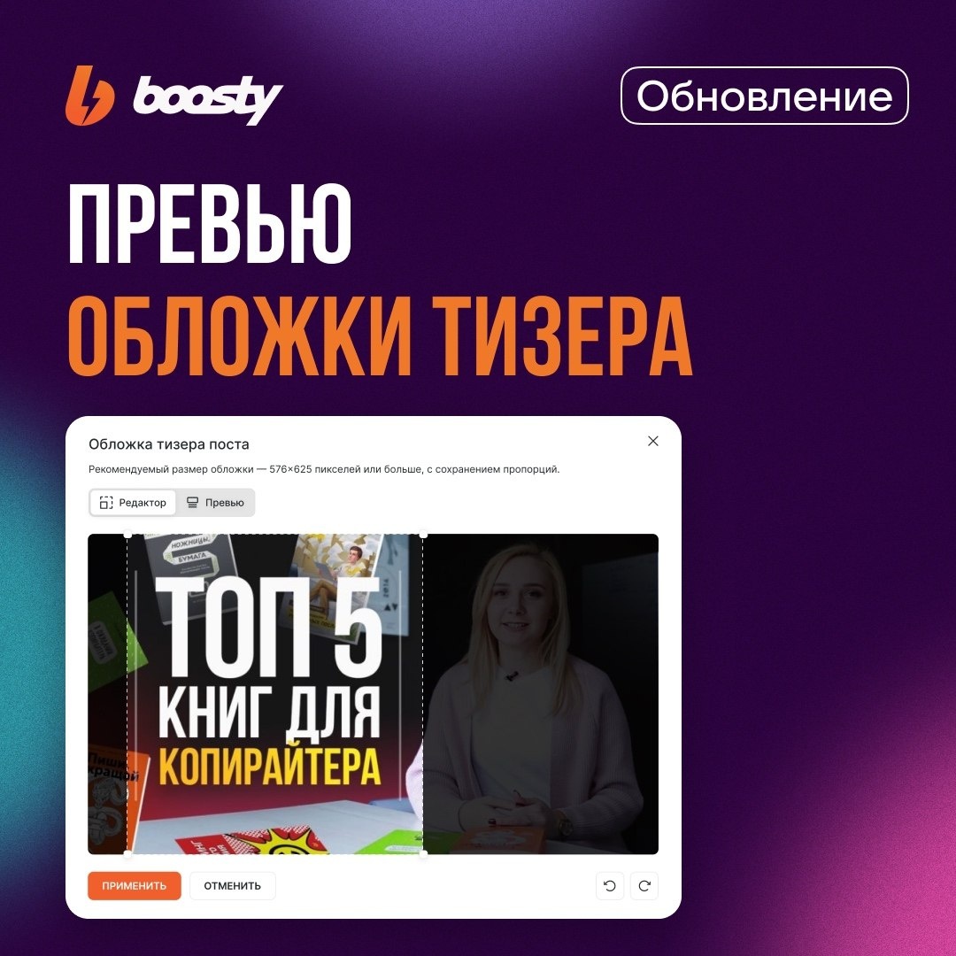 🆕 Небольшое обновление редактора В редакторе Boosty появилось превью обложки тизера. Теперь вы сразу видите, как пост будет выглядеть для аудитории до публикации, и можете заранее проверить визуал. ☝️Напоминаем: именно изображение из блока «Тизер поста» используется как обложка карточки на витрине. Если тизер не заполнен, пост на витрине выглядит пусто, даже если внутри сильный контент или видео с хорошей обложкой. Тизер влияет на восприятие поста и на решение кликнуть, поэтому лучше не оставлять его пустым.