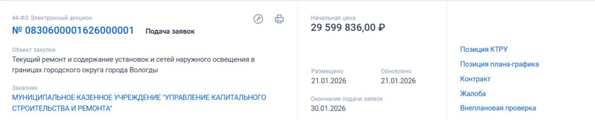 Более 29 миллионов рублей планируют выделить из бюджета Вологды на ремонт и содержание установок и сетей уличного освещения в областном центре. Советующий контракт опубликовали сегодня на официальном сайте Госзакупок. Предмет контракта Исполнитель принимает на себя обязательство оказать услуги по текущему ремонту и содержанию установок и сетей наружного освещения в границах городского округа города Вологды в соответствии с Описанием объекта закупки (Приложение № 1 к муниципальному контракту), в объеме, на условиях и в сроки, предусмотренные контрактом, а Заказчик обязуется принять и оплатить оказанные услуги. Сроки оказания услуг — с 1 марта этого года по конец декабря. Всего, согласно акту описания объекта закупки, проводить ремонты и содержать будут 16 820 установок уличного освещения. 📱 Telegram🐚📱 ВКонтакте🐚💙 Rutube 🐚 📱 Одноклассники