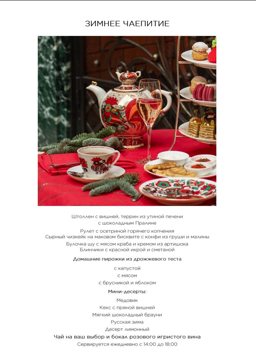 ☕️ В «Гранд Отеле Европа» сделали зимнее чаепитие с правильным петербургским настроением: красная скатерть, сервиз «Красный петух» от Императорского фарфорового завода и тот самый визуальный код “русской темы”, который не выглядит сувенирным. В комплекте — чай на выбор и бокал розового игристого, а подача завязана на детали: текстиль с ручной вышивкой от LAVRSTITCH добавляет ощущение камерности и аккуратной театральности. По еде это не «пара печенек к чаю», а полноценный сет: блинчики с красной икрой и сметаной, домашние пирожки с разными начинками, рулет с осетриной горячего копчения, булочка шу с крабом и кремом из артишока, плюс десертная часть с медовиком, брауни и «Русской зимой». Формат работает как короткий городской ритуал: можно зайти на пару часов, выдохнуть и поймать Петербург без пробок и музеев. #грандотельевропа