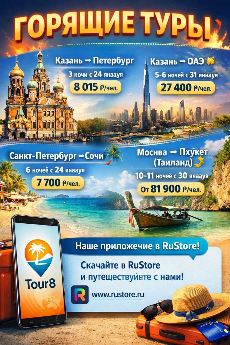 ✈️ 🏨 ГОТОВЫЕ ТУРЫ Казань → Петербург 😄 📅 3 ночи (4 дня) с 24 января 💰 8 015 ₽/чел. Включено: перелет с багажом, отель 3*, трансфер, страховка (Купить можно здесь). 🔹 Выгода для знакомства с городом! Казань → ОАЭ ☀️ 📅 5-6 ночей с 31 января 💰 27 400 ₽/чел. Включено: прямой перелет в ОАЭ, отель, завтраки, трансфер, страховка. Тур здесь. 🔹 Отличный побег от холода! Санкт-Петербург → Сочи 🌴 📅 6 ночей с 24 января 💰 7 700 ₽/чел. Включено: перелет «Аэрофлотом», отель 3*, страховка. 🔹 Море зимой по приятной цене! Здесь! Москва → Пхукет (Таиланд) 🏝 📅 10-11 ночей с 30 января 💰 От 81 900 ₽/чел. Включено: прямой перелет, отель, трансфер, страховка. 🔹 Примеры отелей: — 3* с завтраками: 81 900 ₽ — 4* Maikhao Hotel: 88 500 ₽ — 5* Laya Resort: 115 500 ₽ 🛒 Все туры доступны на сайте и в приложении Тур8 (RuStore). 🎫 АВИАБИЛЕТЫ «ТУДА-ОБРАТНО» Москва → Гянджа (Азербайджан) 🇦🇿 📅 21–23 февраля 💰 12 900 ₽ 🔹 На февральские праздники! Москва → Ереван (Армения) 🇦🇲 📅 Даты в феврал