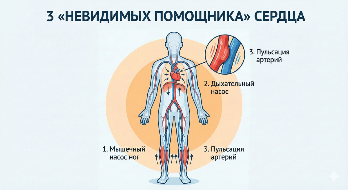 Многие привыкли считать сердце единственным «двигателем» в теле. Но на самом деле природа создала систему невероятной живучести, где каждый орган поддерживает деятельность другого. Сердце — главный насос, но у него есть эффективные локальные помощники, которые берут на себя часть механической работы по циркуляции крови. Сегодня я хочу разобрать три механизма, которые помогают крови возвращаться к сердцу и двигаться по сосудам. Поднять кровь от стоп вверх к сердцу — задача непростая, ведь нужно преодолеть силу гравитации. Здесь на помощь приходят мышцы ног. Когда мы ходим, икры, бедра и ягодицы активно сокращаются. Они механически сжимают глубокие вены, словно выжимая их содержимое. Благодаря венозным клапанам кровь не может течь назад и устремляется вверх. Этот вклад в венозный возврат огромен, и именно поэтому я часто напоминаю вам о важности ходьбы. Движение — это самый простой способ физически облегчить работу вашему сердцу. Наше дыхание влияет на кровоток через изменение давления в