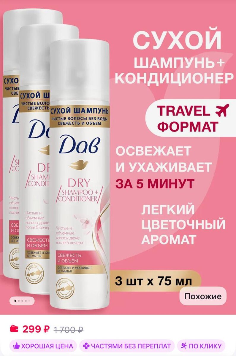 😀😀😀 3 шт Дав Сухой шампунь спрей для темных и светлых волос женский