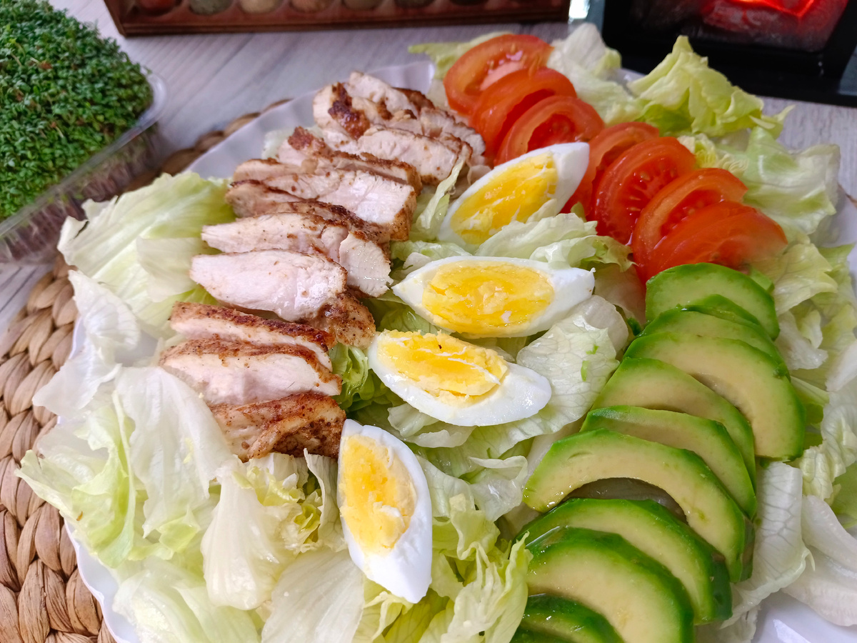 - Сверху разложите ломтики куриной грудки, авокадо, помидоры и половинки яиц.