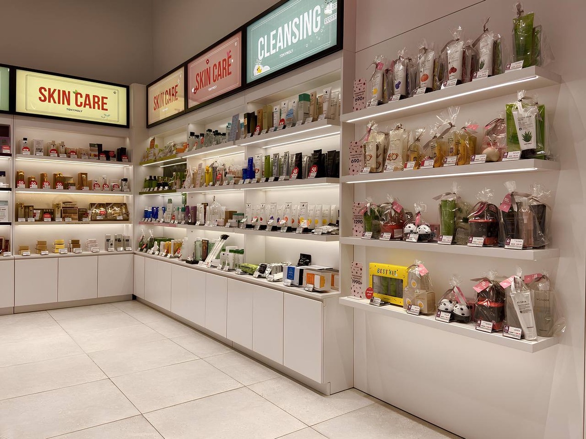 Торговое оборудование для магазина изготовлено по индивидуальному проекту. В пространстве использованы пристенные стеллажи в матовом белом цвете. Под каждой полкой установлена светодиодная подсветка, которая делает выкладку ровной и аккуратной.