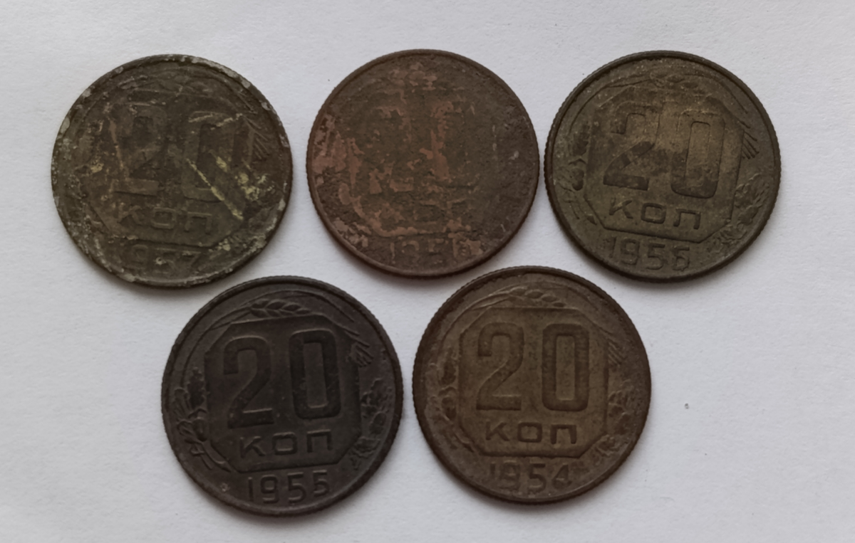 В этот раз решил чистить медно-никелевые монетки без соли и без лука. В этом случае понадобится побольше времени, но результат может быть чуть лучше. Но самое главное - я выбрал медно-никелевые монеты, которые хоть и окислились (стали темными), но в то же время на них не так много темного налета, который "пожрал" всё поле. Вот так выглядят эти монеты: Это монеты 20 копеек 50-х годов. Сами по себе они не представляют какого-то интереса даже в нормальном состоянии. Но у нас за бортом сейчас лютуют морозы, а потому холодным зимним вечером в качестве развлечения можно поэкспериментировать с этими монетами на тот случай, если вдруг попадется монетка интересного года. Не будем тянуть кота за рога - сразу показываю результат (чистил 3 дня без спешки): Не будем рассматривать плохие монетки 1957 и 1956 годов (видимо, они слишком сгнили), а обратим внимание на три монеты, которые почистились более-менее хорошо: Особенно хорошо получилась монета 20 копеек 1954 года: Если её немного "состарит