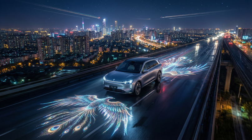 Кадр 1 (Установочный): Ночной городской пейзаж с высоты птичьего полета. Среди рек огней выделяется один движущийся объект — Aito M9. Его пиксельные фары проецируют на асфальт перед собой световой узор, похожий на взмахи крыльев феникса.