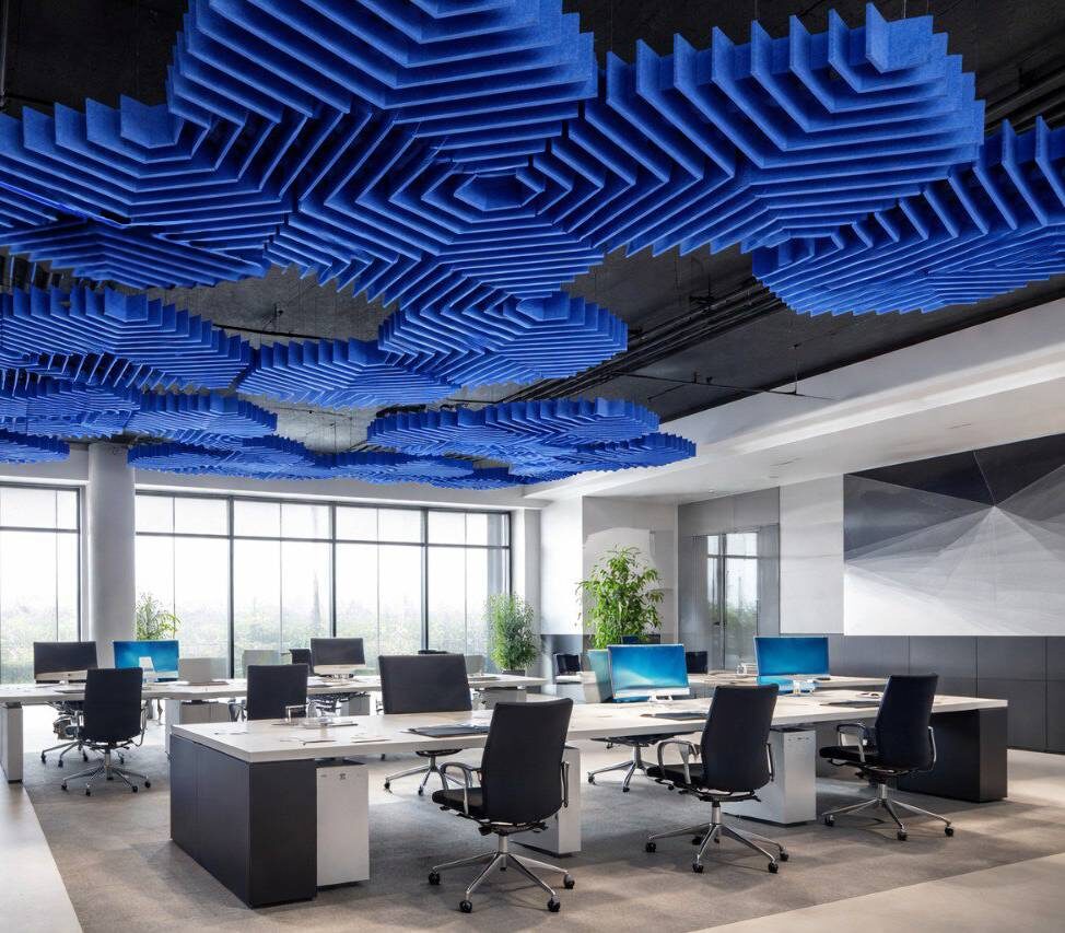 Open-space офис — это высокий шумовой фон и недостаток разборчивости речи в помещении, снижение концентрации. Локальные «острова» или облака, подвешенные над рабочими зонами и зонами встреч поглощают речевой шум и эхо, визуально зонирует пространство без возведения стен, создавая структурированную и стильную среду.