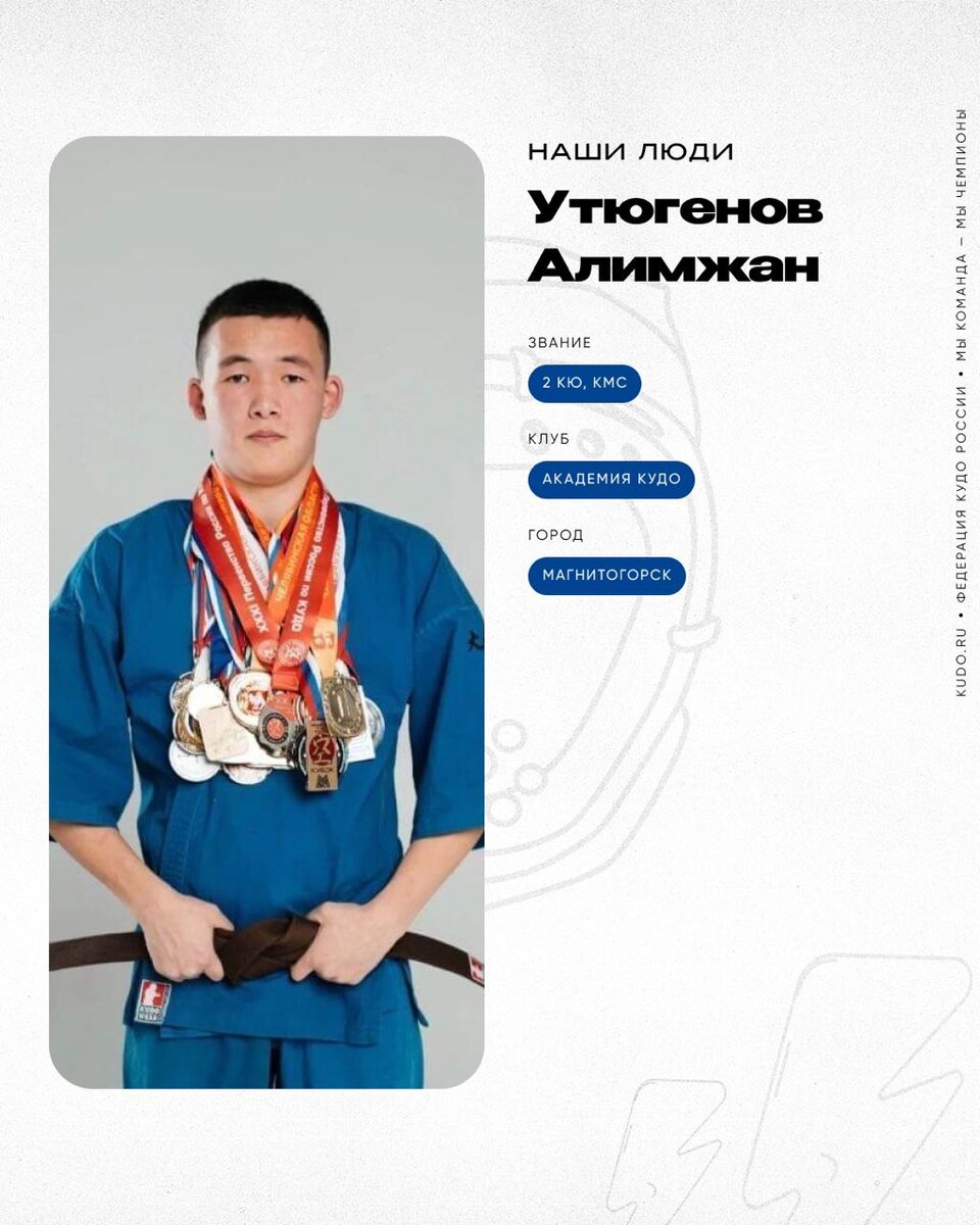 ⠀ 🥋Утюгенов Алимжан — 2 кю, КМС Студент педколледжа, будущий учитель физкультуры и хладнокровный целеустремлённый боец. Не боится неудач и продолжает двигаться к цели, несмотря ни на что. Любит кудо за реалистичность. ⛩ Спортивный клуб — «АКАДЕМИЯ КУДО» 📍 Город проживания — г. Магнитогорск Алимжану Утюгенову 17 лет, он учится в педагогическом колледже на учителя физической культуры, интересуется автомобилями и не мыслит своей жизни без единоборств. Алимжан пришёл в кудо, когда ему было всего 5 лет. Сейчас он гордится, что начал заниматься этим видом спорта. 👉 Читайте продолжение интервью на нашем сайте — https://kudo.ru/people/utyugenov-alimzhan/