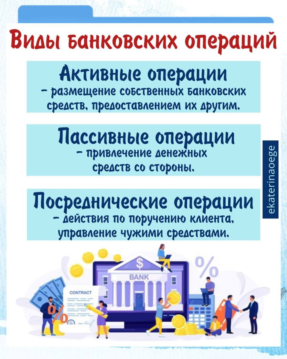 🔴🔴🟠🟠🔴🔴🟠🟠🟠 ⚠️В методических рекомендациях по итогам ЕГЭ дали список терминов, на которые составители советуют обратить внимание! Среди них есть и виды банковских операций! Разбираем👇 Виды банковских операций с примерами! ✔️Активные операции: ✔️Предоставление кредитов Пример: «Т-банк» выдал кредит в размере 300 тыс. рублей под 28 % годовых Александру Петровскому, перед этим запросив данные о ежемесячном доходе, чтобы убедиться в его платежеспособности. ✔️Открытие и обслуживание текущих счетов клиентов банка (для физ. лиц - лицевые счета, для р. - расчётные счета). С помощью текущего счета можно осуществлять денежные операции Пример: «Совкомбанк» открыл лицевой счет для своей новой клиентки Натальи Селиной по ее письменному обращению и выпустил для нее дебетовую карту для расчетов. ✔️Осуществление расчетов между организациями, фирмами, гражданами Пример: Фирма «Лютик», имеющая расчетный счет в «ВТБ» перевела фирме «Ромашке» 157 000 рублей на ее расчетный счет. ✔️Кассовые
