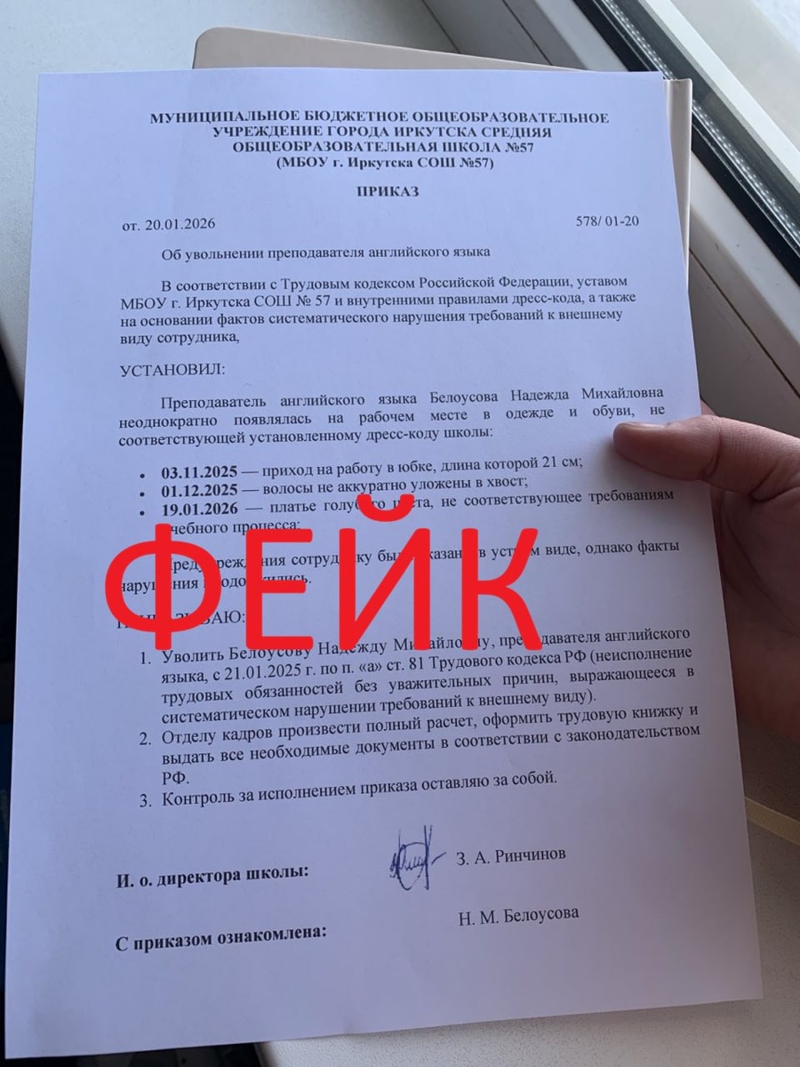 Подписал документ вполне адекватный директор школы Зорикто Ринчинов, увольняет он довольно возрастного педагога Надежду Михайловну Белоусову. Которая во-первых, работает в школе 12 лет. Во-вторых, короткие юбки в силу возраста не носит много лет. В-третьих, 20 сантиметров - это расстояние между указательным и большим пальцем руки. Юбки такой длины могут быть только у кукол ростом 80 сантиметров. Ну и на сладкое: статья 81 ТК РФ, на который ссылается якобы “приказ”, вообще не содержит норм, по которым педагог “увольняется”, там тупо другой текст. В общем, фейк удался, посмеялись. Единственное, что осталось за кадром - кто эта обиженная “Надежда”, которая раскидывает по предложкам тг-каналов эту несусветную чушь: специалист ЦИПсО с Украины или школьник старших классов, который с помощью искусственного интеллекта мстил педагогу за тройку. Кстати, московские каналы, которые делаются искусственным интеллектом (такие как этот), всё это публикуют, потому что не проверяют информацию и не