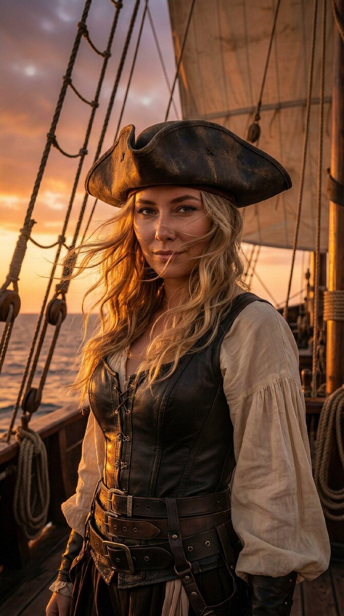 : Промт: Создай кинематографическую художественную фотографию в стиле приключенческого пиратского кино. В кадре женщина в образе пиратки: кожаный корсет или жилет, светлая рубашка с объёмными рукавами, пояс с ремнями и металлическими пряжками, на голове широкополая пиратская шляпа. Локация — палуба старинного корабля, вокруг канаты, паруса, океан. Свет тёплый, закатный, ветер развевает волосы. Выражение лица уверенное и дерзкое. Лицо точно передано с приложенного фото, без искажения черт и пропорций. Атмосфера свободы, силы и харизмы. 🔥 Бот №1 для создания фото и видео (первые 2 фото бесплатно!) 🔥 Бот №2 для создания фото и видео ✨ Копируем промт ✨ Переходим в любого Бота ✨ Выбираем NanoBanana (лучше PRO) ✨ Вставляем свое фото и промт и вуа-ля! Ваша фоточка готова 🤩 ✨ Клуб по нейросетям за 590 руб. Делитесь инструкцией с друзьями и не забывайте ставить реакции, чтобы я понимала, что вам такое интересно 🤩