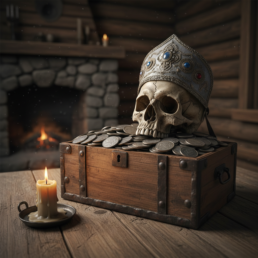 И она рассказала мне историю. Про этих соседей, что за одну ночь сошли с ума, обмазав дом изнутри глиной и углём, будто пытаясь закупориться от того, что сами же выпустили. Про ларь под полом с тусклыми серебряными монетами и женским черепом в кокошнике, который, казалось, ухмылялся в темноте. Про врача и урядника, что списали всё на «испарения от разложившегося трупа», потому что так проще, так спокойнее для живых.