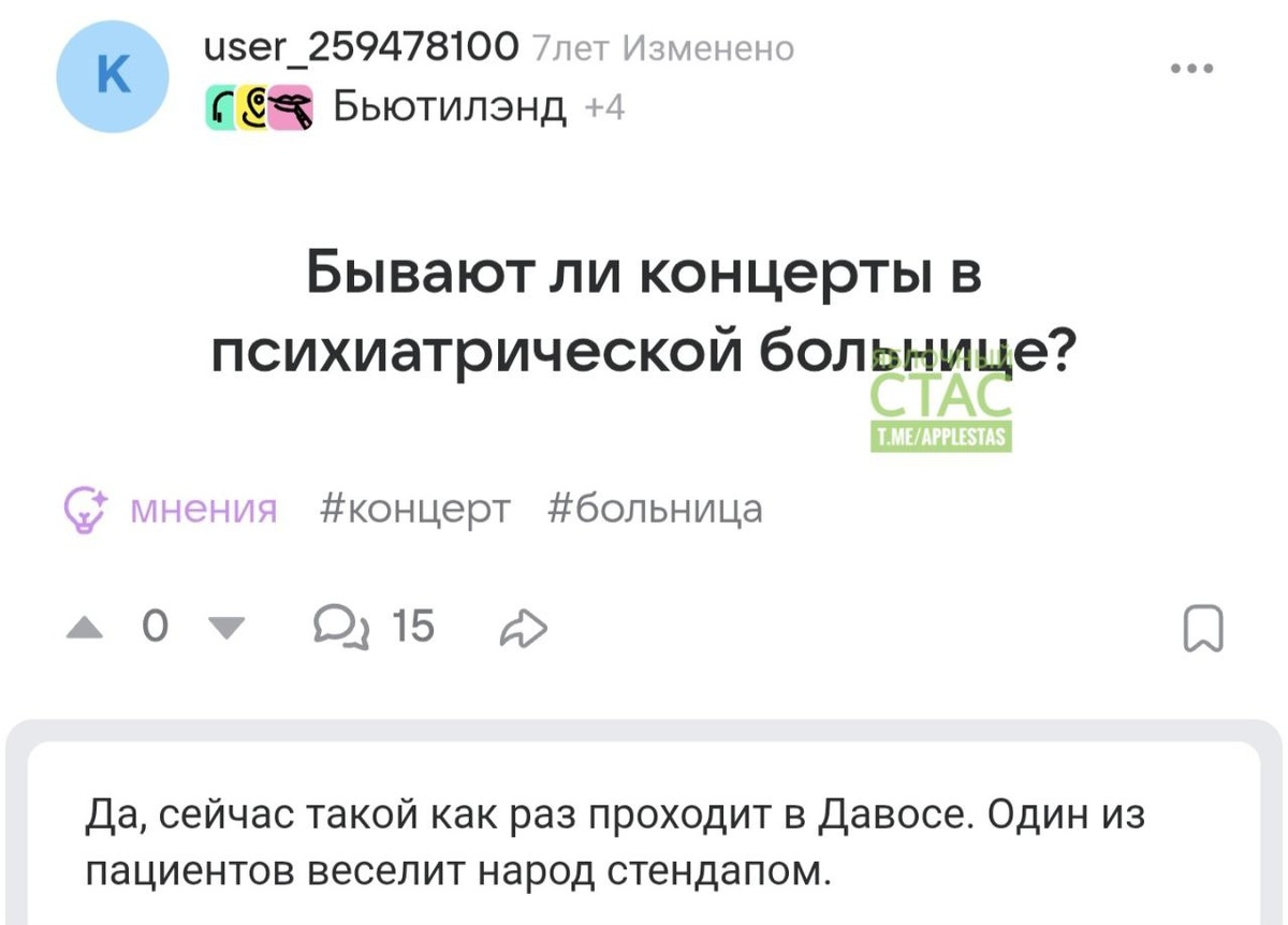 У рыжего из первой палаты обострилась мания величия. Один псих достал обрез и играет им на пианино. Второй ходит в помещении в темных очках, что-то кричит про базуку и требует называть себя Рэмбо. Сумасшедший гинеколог падает в обморок при слове "Путин". Яблочный Стас