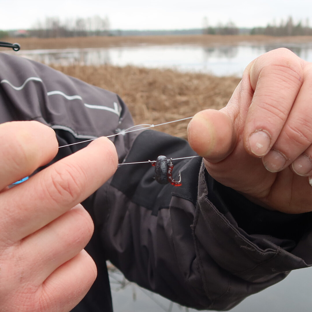Одна из популярных приманок для ловли со льда – балда со свободно двигающимися по леске одинарными крючками, привязанная на петле. У этой приманки рыбу привлекают разные её части: бывают поимки, когда окунь проглатывает балду полностью, даже с порцией ила на дне, а случается, что аккуратно хватает один из крючков. Таким образом сползающие вниз крючки также являются объектом атаки. Поэтому петлю для привязывания балды нужно делать длиной не меньше 5 см – чтобы крючки могли какое-то время двигаться по леске после взмаха. В процессе ловли необходимо следить, чтобы оба крючка именно опускались, а не зависали, и, тем более, не путались между собой. Поэтому петлю после привязывания и периодически в процессе рыбалки полезно растягивать руками, чтобы параллельно идущие лески не цеплялись одна за одну. Сами крючки лучше всего подойдут с небольшим колечком – это обычные модели для поплавочной или фидерной ловли. Размер их подбираем таким образом, чтобы длина цевья была чуть меньше длины самой пр