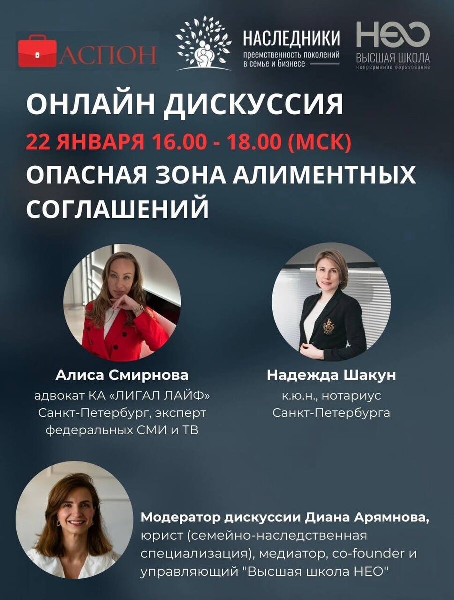 сделки недействительной при несоблюдении части 2 статьи 103 Семейного кодекса РФ. Как защититься плательщику от «довзыскания» алиментов и какие обстоятельства должен проверить нотариус при удостоверении сделки? И завтра мы разберем реальный кейс из практики адвоката Алисы Смирновой по признанию соглашения недействительным, как не соответствующего статье 103 Семейного кодекса РФ. Спикеры: 📍Надежда Шакун, к.ю.н., нотариус Санкт-Петербурга; 📍Алиса Смирнова, адвокат КА «ЛИГАЛ ЛАЙФ» Санкт-Петербург, эксперт федеральных СМИ и ТВ. 👩💻 Модератор: Диана Арямнова, юрист по семейно-наследственным спорам, управляющий и co-founder Высшая школа НЕО ➡️ Регистрация по ссылке: https://wwl.aspon.org/40/?bc=803890817 🗓️ Дата: 22.01.2026 в 16:00 Формат: онлайн 💸 Стоимость: 4 900 рублей Запись дискуссии и материалы от спикеров будут направлены каждому участнику. До встречи!