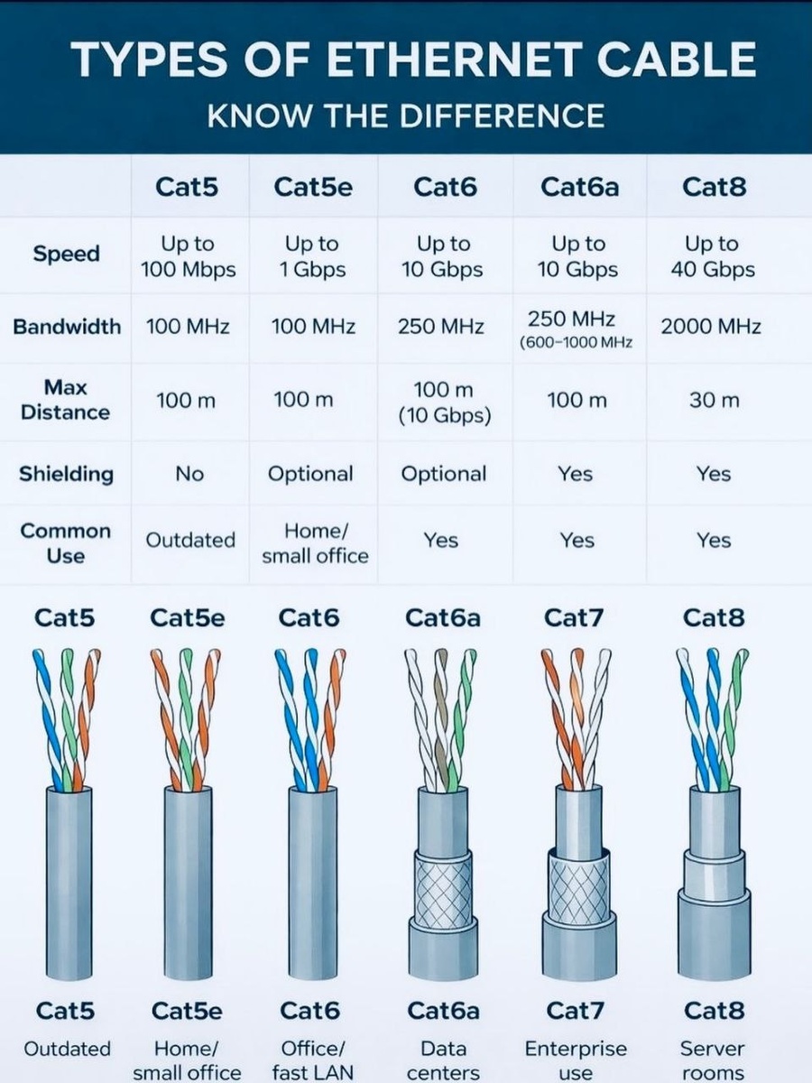 🟢 CAT5e – Бюджетный, но всё ещё надежный 🟠 CAT6 – Офисный фаворит (скорость + надёжность) 🔵 CAT6a / CAT7 – Экранированный (для мест с помехами) 🔴 CAT8 – Монстр скорости для дата-центров #Windows #Советы #Лайфхак #DigitalDeck #Компьютер #Полезное ☺️ DigitalDeck | ♥️ Boost
