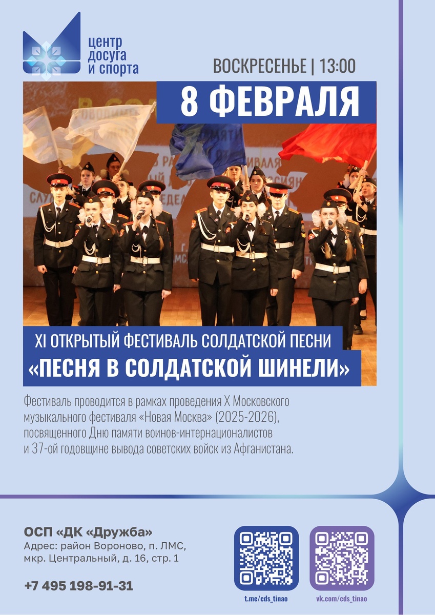 »! 🎶 Дорогие друзья, любители и исполнители военно-патриотической песни! Мы приглашаем вас стать частью масштабного события, посвященного мужеству и подвигу. 📅 Когда: 8 февраля 2026 года 🕐 Время: 13:00 ✅ Как принять участие: 1. Подать заявку по ссылке: https://forms.gle/e2vu52UmNrTTmgk99 2. До 31 января 2026 года направить на электронную почту dkdruzhba_metod.kab@mail.ru: • Подписанную фонограмму номера (формат mp3). • Сканы подписанных согласий (Приложение 1 и 2). ⚠️ ВАЖНО: • От каждого учреждения принимается не более трёх заявок. • Подробная информация о требованиях и правилах — в Положении о Фестивале. Не упустите возможность проявить свой талант и почтить память героев песней! 🇷🇺 С уважением, ОСП «ДК «Дружба» #анонсывороново #анонсытинао #новоститинао