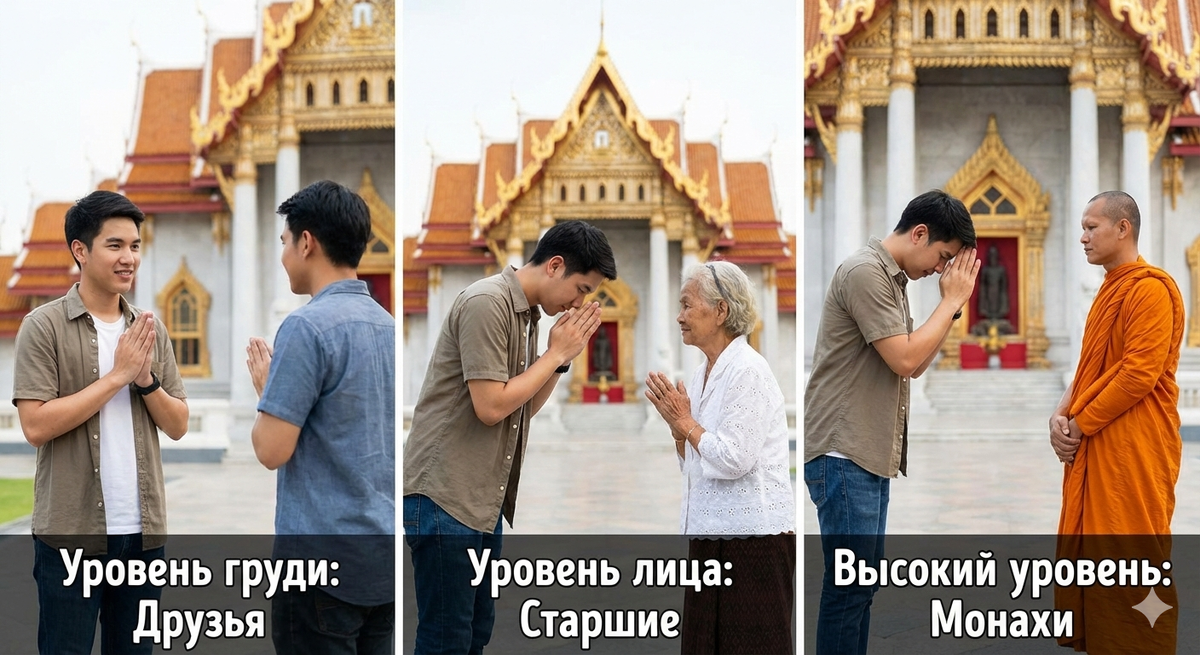 Вы наверняка видели это сотни раз: таец складывает ладони лодочкой у груди и слегка кланяется. Это - Вай (Wai). Кажется, всё просто: обычное приветствие, аналог нашего рукопожатия. Но для тайца Вай - это сложная система «социальных координат». Высота ваших рук и глубина поклона говорят о том, насколько вы уважаете собеседника и кем его считаете. Если сделать Вай неправильно, можно либо унизиться, либо ненароком оскорбить человека. Разбираем «язык ладоней», чтобы вы чувствовали себя в Таиланде как свой. Главное правило: младший всегда первым приветствует старшего. Если вы турист (фаранг), тайцы часто первыми делают вам Вай из вежливости как гостю, но по этикету инициатива должна исходить от того, кто ниже по статусу или возрасту. Вот три основных уровня «высоты» ваших рук: Многие туристы, желая быть вежливыми, начинают «ваеткать» направо и налево. Но есть ситуации, где это выглядит нелепо: Вай - это не просто жест, это способ показать, что вы цените гармонию и порядок в обществе. Тайцы