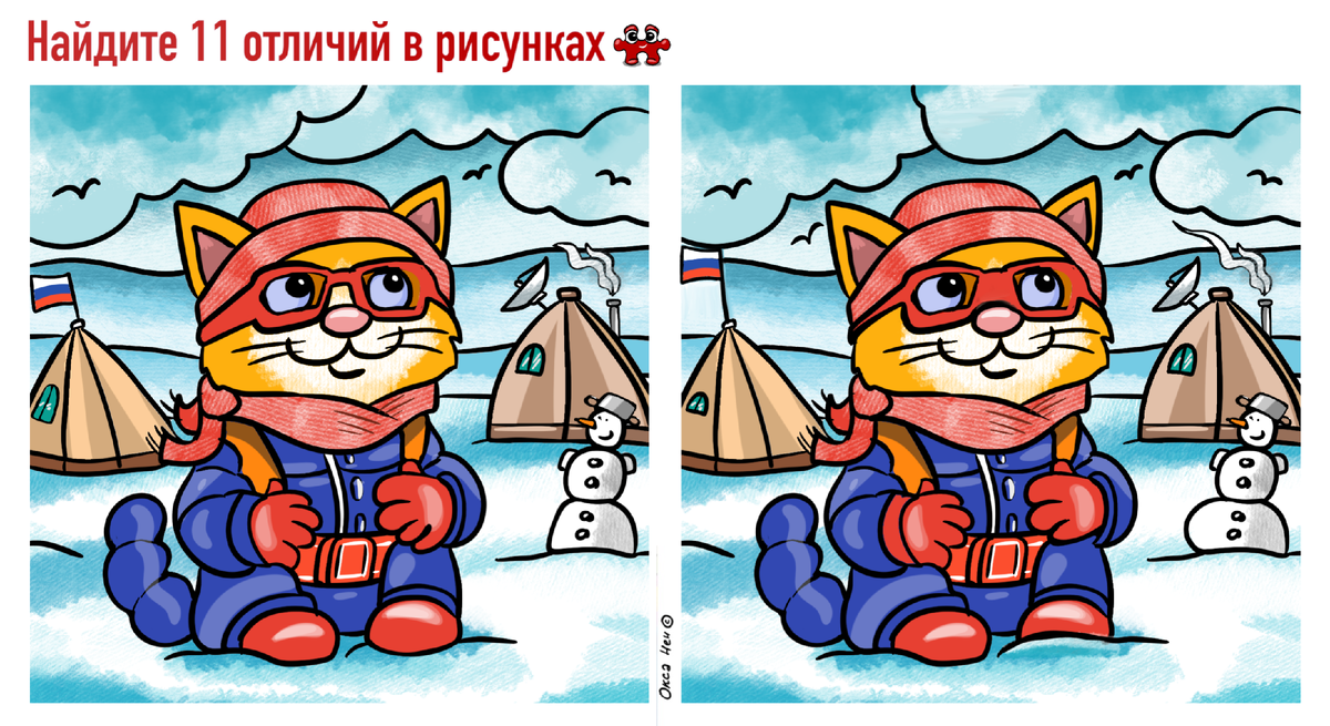 Сегодня мы поймали нашего котейку в дальней загадочной экспедиции. То ли арктика, то ли Гренландия - не понятно, а мороз-то какой трескучий. Что потерял в таких далях рыжик я не знаю, но вот найти здесь можно целых 11 отличий. Удачи!