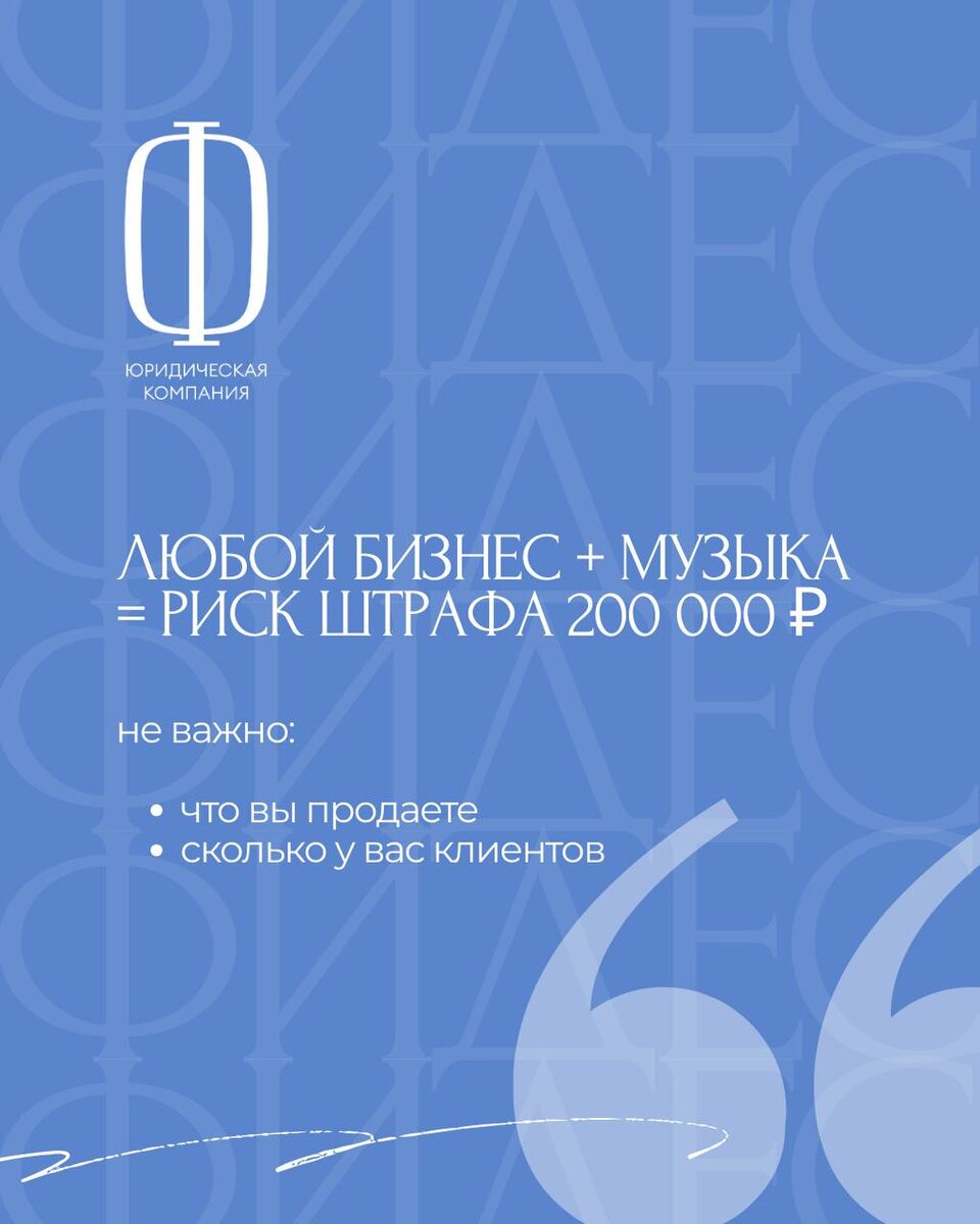 ❌ ТРИ ОПАСНЫХ ЗАБЛУЖДЕНИЯ Миф 1: "Я плачу за ЯндексМузыку/— значит, могу включать в заведении" Нет. Эти подписки — для личного использования. Публичное воспроизведение = нарушение авторских прав. Миф 2: "Музыка играет фоном, это не коммерческое использование" Если музыка звучит в месте, где вы зарабатываете — это коммерция. Миф 3: "Мы маленькое кафе, нас не найдут" РАО (Российское авторское общество) специально ищет нарушителей. Это их бизнес-модель. СКОЛЬКО ЭТО СТОИТ Штрафы за нарушение: • От 10 000 до 200 000 ₽ (ст. 1301 ГК РФ) • Компенсация правообладателям • Конфискация оборудования (в теории) Легальное использование: • Договор с РАО — от 3 000 ₽/месяц (зависит от площади) • Лицензионные музыкальные сервисы для бизнеса • Royalty-free музыка ✅ ГДЕ НУЖНА ЛИЦЕНЗИЯ Если у вас: - Кафе/ресторан - Магазин/торговый центр - Салон красоты - Фитнес-клуб - Офис с клиентами - Такси/автобус - Мероприятие И там играет музыка — нужна лицензия. ЧТО ДЕЛАТЬ: Вариант 1: Заключить договор с РАО