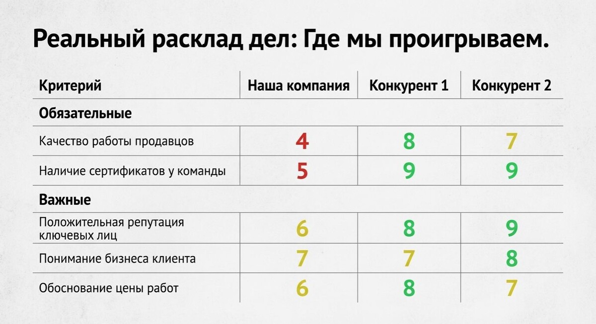 Чтобы понять, почему клиенты уходят, и что с этим делать, существует предельно простой метод. Он не требует дорогих консультантов, но требует максимальной честности от самих себя. Это анализ методом бенчмаркинг. О нем я расскажу подробнее в следующей статье. Вся эта методика абсолютно бессмысленна без одного ключевого компонента — предельной беспристрастности. Любая попытка приукрасить действительность, замолчать недостатки или выставить себе оценку повыше — это самообман. А самообман в кризис — это гарантия провала. Да, от правды будет неприятно, но это лучше, чем потерять бизнес. Если вы не готовы признать, что ваши продавцы работают из рук вон плохо, что у вас нет внятных кейсов или что ваша репутация оставляет желать лучшего, то никакой анализ вам не поможет. Времена, когда можно было выезжать на красивых словах, прошли. Иногда эта честная оценка вскрывает не только ваши провалы, но и провалы всего рынка. Если вы видите, что не только вы, но и ваши конкуренты не дотягивают до миним