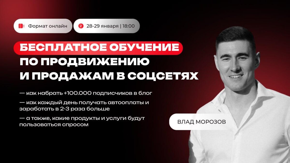 Если ты все еще думаешь как набрать +50.000 подписчиков и зарабатывать от 1млн ₽+ на своем блоге, то это 2х дневное обучения для тебя. 📍Обучение пройдет в ОНЛАЙН формате 28-29 января в 18:00 по Мск. Это будет КОНЦЕНТРАТ рабочих связок и инструментов, после изучения которых ваши подписчики в соцсетях начнут расти и платить вам деньги за услуги/курсы/товар. На обучение тебя ждет: 💥наглядная и пошаговая схема продвижения блога 💥инструменты по продажам и заработку 💥ценная практическая информация Это точно для вас, если: ▪️ вы постоянно думаешь как набрать подписчиков ▪️ вы уже пробовали, но не получилось ▪️ вы не знаете с чего начать ▪️ вы задумываетесь создать актив приносящий деньги НА ОБУЧЕНИЕ БУДЕТ ДОСТУПНО ВСЕГО: 300 мест. Регистрируйся по ссылке: https://clck.ru/3RNLAg После обучения вы: ▪️Поймете, как набрать десятки тысяч подписчиков ▪️Узнаете актуальные инструменты и ТРЕНДЫ 2026 года ▪️Научитесь создавать востребованный контент ▪️Сможете зарабатывать на блоге, даже от 5