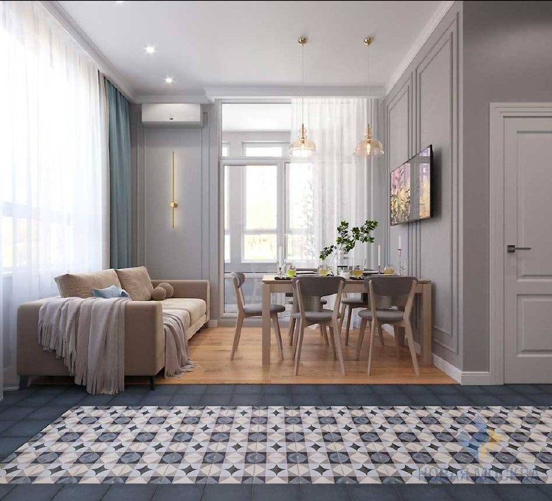 Проект квартиры в ЖК «Скандинавия» — очередная успешная история дистанционного сотрудничества заказчика с командой СК «Новая Москва». Хозяин жилья работает в Германии и планирует возвращаться в Москву, где его будет ждать просторная квартира с современным ремонтом в полной комплектации. Расположение и размер помещений от застройщика полностью устраивали заказчика, поэтому в исходную планировку вмешиваться не стали. На площади 97 кв. м расположились прихожая, гардеробная, гостевой санузел, постирочная, мастер-спальня со своим санузлом, кухня-гостиная с выходом на лоджию, детская и кабинет. Интерьер сочетает в себе приметы современного и неоклассического стилей. Общее спокойное настроение отделки и обстановки дополнено декоративными элементами, которые придают пространству характер. Активный орнамент плитки в прихожей и на кухне задают функциональные маршруты, акцентные обои и рамки молдингов деликатно зонируют помещения. За цветовую основу взяты серый и бежевый оттенки, акценты рас