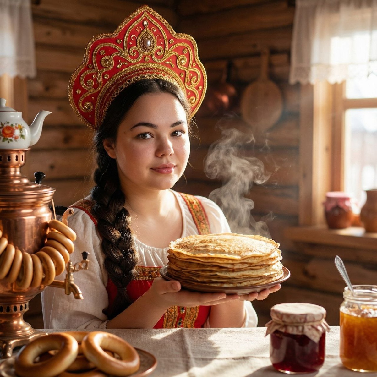 чертами лица, одетой в великолепный традиционный русский красно-золотой кокошник, с длинной толстой каштановой косой, перекинутой через плечо. Она стоит в уютной деревянной кухне в деревенском стиле рядом с традиционной плитой, простирающейся от бедер и выше. На уровне груди она держит два больших, идеально круглых, золотисто-коричневых дымящихся блина (блини). Плечи открыты. На деревянном столе на переднем плане: блестящий медный самовар, вереница баранков и маленькие керамические вазочки, наполненные блестящим клубничным джемом и густым белым сгущенным молоком. Теплый утренний солнечный свет, праздничная атмосфера Масленицы, разрешение 8k, сверхдетализированные текстуры. #масленица