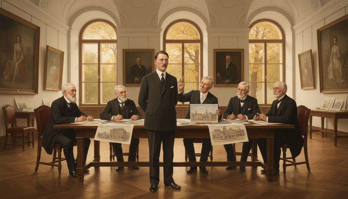 К 1912 году Гитлер оканчивает академию со средними оценками. Он не гений, но крепкий профессионал. Устраивается в венское архитектурное бюро, где занимается эскизами общественных зданий. Работа рутинная, но стабильная. По вечерам пишет акварели с видами Вены — продаёт их туристам через галереи. Скромный, но достойный доход.
