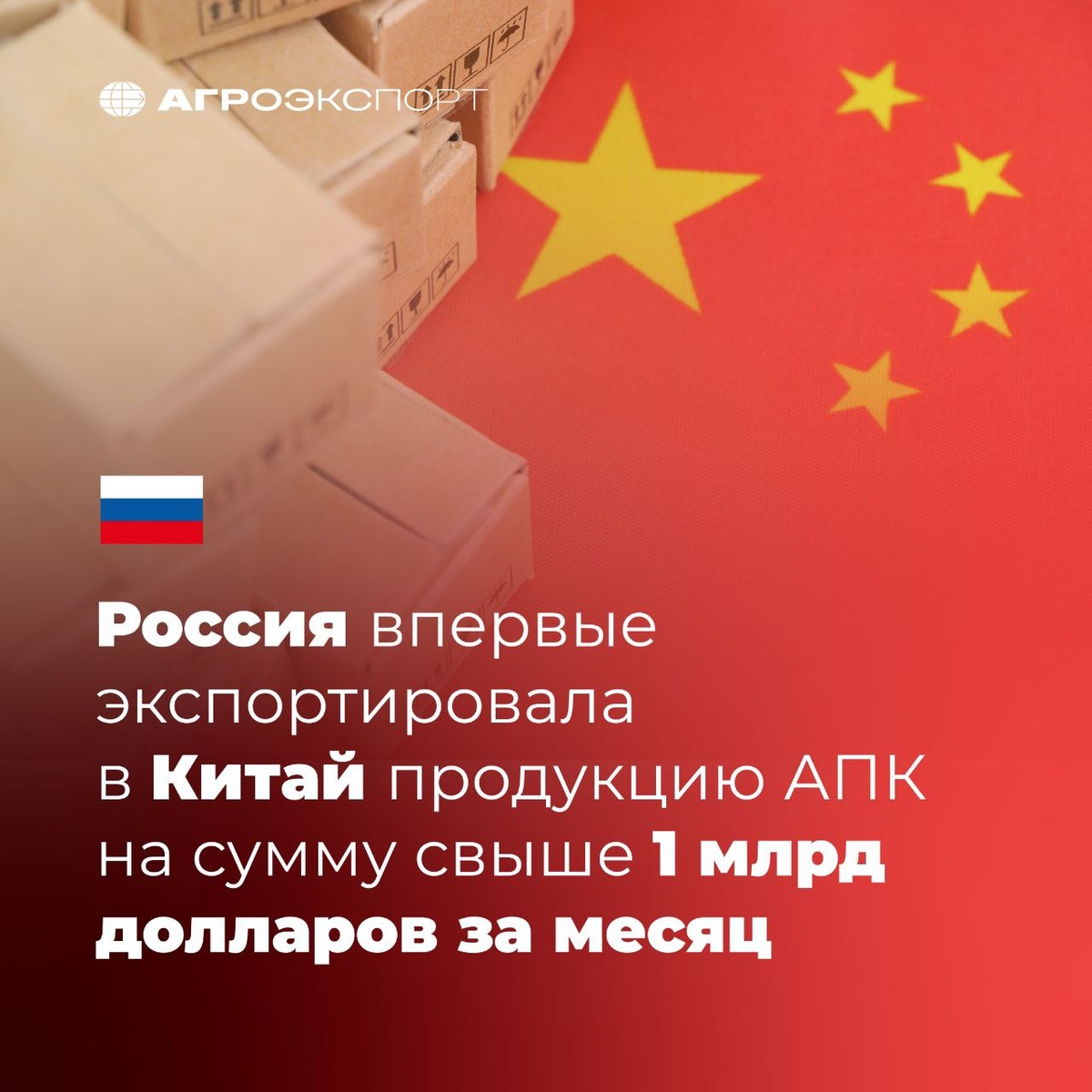 Россия впервые экспортировала в Китай продукцию АПК на сумму свыше 1 млрд долларов за месяц