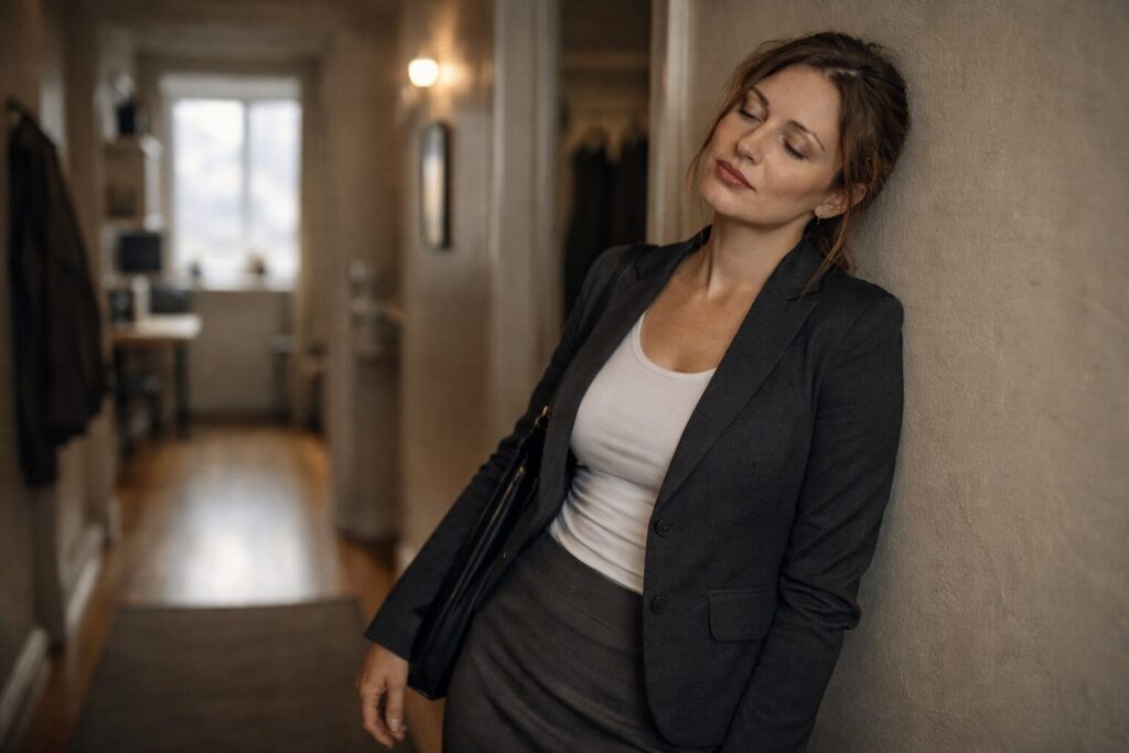 Марина стояла перед зеркалом в прихожей. Пиджак — старый, ещё с прошлой работы, пять лет назад. Тесноват в плечах. Юбка — единственная приличная, серая, до колен. Туфли на каблуке — ноги уже болят, а ещё никуда не вышла.