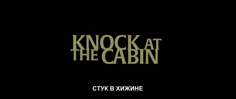 "Стук в хижине" - художественный фильм в жанре мистического триллера. Режиссер - М. Найт Шьямалан. Счастливая семья из двух мужчин и ребенка приезжают в лес, отдохнуть в доме. Пока дочка гуляет в лесу, к ней приходит познакомиться большой дядя, и начинает говорить странные вещи типа - мы не хотим, но так надо. В итоге в дом отцов и дочки приходят компания 4 людей - двое женщин и двое мужчин. Они утверждают что "семья" должна принести одного из семьи в добровольную жертву, что бы остановить пришествие Апокалипсиса. Пока они их держат, что бы как-то отсрочить конец света они начинают убивать себя (те которые пришли вчетвером). Так же по ходу развития событий в мире происходят глобальные котастрофы. В конце концов один из отцов уверовал в происходящее и просит второго принести его в жертву. После этого загадочным образом все негативные события в мире прекращаются. Если вы думаете что это Шьямалан в очередной раз придумал что-то трудноусвояемое - то это не так. Первоисточник это роман 20