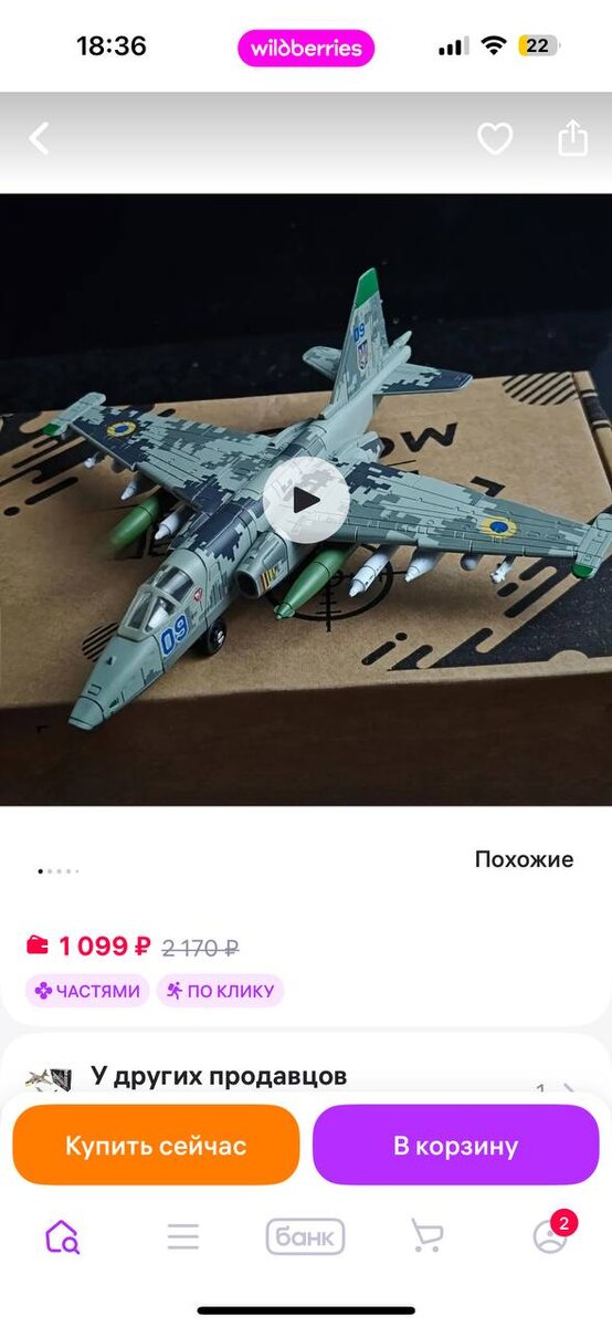 ? Помню как то Воевода тоже натыкался на шевроны врага на вайлберис… Ну кто это, как не враг? Оставил ссылку, может кроме меня кто ещё жалобу напишет, и к хохлам заглянет тов. Майор. Сборная модель Су-25 1 72 коллекционный самолёт https://www.wildberries.ru/catalog/600337308/detail.aspx?size=817601988